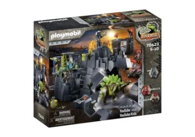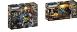 Playmobil 2er Set bestehend aus:PLAYMOBIL® 70623 Dino RockPLAYMOBIL® 70629 Uncle Rob: Aufrüstung zum KampfPLAYMOBIL® 70623 Dino RockBei Team Dino Rise ist doppelte Dino-Mensch-Power angesagt. Immer wieder versuchen die gierige Ludmilla und ihr Handlanger Ralph die drei Portalsteine in die Finger zu bekommen, um so das magische Portal im Dino Rock zu öffnen. In ihrem Testlabor analysieren sie Steine und arbeiten an einem neuen Bohrroboter. Doch Team Dino Rise ist wachsam und stellt sich Ludmilla und der Comet Corporation mutig entgegen. Das Baumhaus am Dino Rock dient den Teenagern als Einsatzbasis. In einem gut getarnten Verschlag an der Felswand planen sie ihre Verteidigungsstrategie. Über den drehbaren Lastenaufzug versorgen sie sich mit Vorräten und Werkzeugen. Eine Klappbrücke führt in ein geheimes Höhlenversteck. Greift die Comet Corporation an, steht zur Verteidigung die schwenkbare Doppelkanone bereit. Im Notfall geht es über die geheime Rutsche unter der Brücke ins Freie. Natürlich würde Team Dino Rise niemals ohne ihre Dinofreunde ins Gefecht ziehen. Um den Stegosaurus aus dem Felsen zu befreien, legt Ian einen Energiestein in den Schlüssel ein, steckt ihn in den Felsen und dreht ihn um. Mit riesigem Donner brechen die Felsteile auf und der Urzeitriese springt mit gigantischem Dinogebrüll aus dem Felsen. Die Comet Corporation kann sich auf etwas gefasst machen! Das Spielset enthält die Dino Rise-Charaktere Ian, Ludmilla und Ralph, einen Stegosaurus, ein Testlabor mit Analysestation, Energiesteine, ein Bohrfahrzeug sowie einen Dinofelsen und viele weitere Extras für actionreiche Dinoabenteuer. Eindrucksvolle Effekte: Beim Einsetzen und Herausnehmen der Energiesteine werden verschiedene Licht-, Sound- und Vibrationsfunktionen des Dino Rock ausgelöst. Nur wenn alle drei Energiesteine in der richtigen Position in den Felsen eingesetzt werden, öffnet sich das magische Portal in die Welt der Dinos.