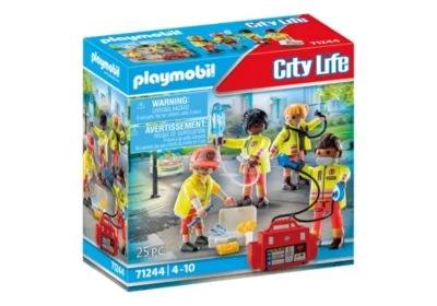 Playmobil 2er Set bestehend aus:PLAYMOBIL® 71244 RettungsteamPLAYMOBIL® 71204 RettungscaddyPLAYMOBIL® 71244 RettungsteamFiguren: 2 Männer, 2 Frauen; Zubehör: 1 Infusion mit Infusionsschlauch, 1 Stetoskop, 1 Erste Hilfe Instrumente, 2 Verbandsschienen, 1 Wasserflasche, 1 Defibrilator, 1 Verbandskoffer, 1 Cap, 1 ArmbanduhrPLAYMOBIL® 71204 RettungscaddyFiguren: 1 Sanitäterin, 1 Sanitäter, 1 Verletzter
