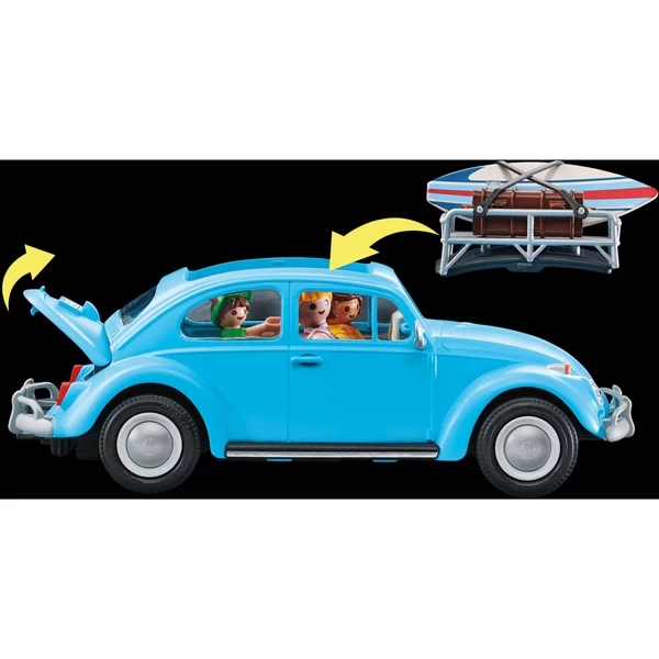 Der VW Käfer ist ein echter Klassiker. Jetzt hält der kultige Kleinwagen mit seiner unverkennbaren Form Einzug in die fröhliche PLAYMOBIL-Welt. Natürlich besitzt der PLAYMOBIL-Käfer alle charakteristischen Merkmale, die ihn so einzigartig machen, wie die geschwungenen Kotflügel, das VW-Logo, die senkrechte Windschutzscheibe, die blaue Farbe und die typische Heckmotorhaube mit 4 Zylinder Boxermotor. Nach dem Abnehmen des Daches wird der liebevoll gestaltete Innenraum mit beigen Sitzen, Armaturenbrett und Lenkrad sichtbar. Auf der Rücksitzbank ist Platz für das Kind, sowie Kühltasche, Sandspielzeug und Handtuch. Koffer und Surfbrett für den Strandausflug werden mit zwei Riemen auf den Dachgepäckträger geschnallt. Jetzt heißt es einsteigen und ab zum Strand! Das Spielset enthält drei PLAYMOBIL-Figuren, einen Volkswagen Käfer von PLAYMOBIL mit Dachgepäckträger, abnehmbarem Dach und Heckklappe zum Öffnen, Surfbrett, Kühlbox, Sandspielzeug und viele weitere Accessoires.Art.-Nr.: 1681382