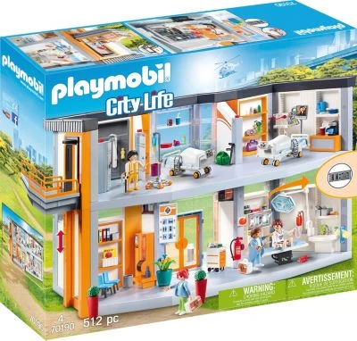 Zubehör: 1 Krankenhausgebäude mit Aufzug , 1 schwenkbare OP Leuchte, 1 leuchtender OP-Monitor, 1 Rollcontainer für OP-Besteck, 1 Behandlungsliege, 1 Überwachungsmonitor, 1 rollbarer Infusionsständer, 2 Infusionen mit Schlauch, 2 Infusionsschläuche, 1 Infusionszugang, 1 Mundschutz, 2 Arztkoffer, 1 Set OP- Besteck, 1 Stethoskop, 1 Reflexhammer, 1 Mikroskop, 1 Reagenzglasständer, 3 kleine Schraubgläser, 2 große Schraubgläser, 1 Tube Salbe, 1 Klemmbrett, 2 Röntgenbilder, 2 Einschübe für beleuchteten Monitor, 2 Patienteninformationen, 1 Stickerbogen mit Pflaster- und Bandageetiketten, 2 Krankenbetten, 1 Patienten-TV, 1 Waschbecken, 1 Waschtisch mit Toilette, 2 Krücken, 1 Handtuch, 3 Kosmetikflaschen, 2 Paar Patientenschuhe, 1 Tücherbox, 1 Brotdose, 1 Haarbürste, 2 Zahnbürsten, 2 Packungen Mullbinden, 1 Wecker, 2 Stühle, 1 Anzeigetafel, 1 Getränkeautomat mit 4 Getränkeflaschen, 2 Pflanzbehälter mit Pflanzen, 1 Blumentopf mit Blumen, 2 Mülleimer, 1 Aufbewahrungskorb, 1 Aufbewahrungsbox, 1 Hocker, 1 Laptop, 2 Getränkebecher, 5 Ordner, 1 Schreibtischlampe, 1 Espressomaschine, 1 schnurloses Telefon, 1 Vase mit Blumen, 1 Tasche, 4 Teller, 4 Tassen, 2 Löffel, 1 Apfel, 3 Medikamentendosen, 3 Zeitschriften, 1 Feuerlöscher, 1 Buch, 1 Spritze