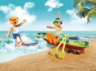 Ab zum Strand zum Schnorcheln, für einen Surfausflug oder eine Kanutour. Mit vielfältiger Wassersportausrüstung.Maße Strandauto: 19 x 10 x 9 cm (LxTxH).Maße Anhänger: 28 x 11 x 6 cm (LxTxH).Details:Das Strandauto ist mit einer Anhängerkupplung ausgestattet und NICHT RC-fähig. Im Auto ist Platz für zwei Figuren (als Beifahrer auch Kinderfigur möglich).Mit dem Anhänger kann das Kanu transportiert werden. In den seitlichen Staufächern ist u.a. Platz für die Bremskeile.Das Kanu schwimmt und bietet Platz für zwei Figuren (auch Kinderfiguren möglich).Auf den Surfbrettern lässt sich je nach Drehung der Fußklemmung eine Erwachsenen- oder eine Kinderfigur fixieren.