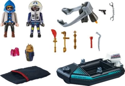 Das Museum wurde beraubt! Bei der Polizei wurden wertvolle Kunstgegenstände als gestohlen gemeldet. Der Dieb kann noch nicht weit gekommen sein. Mit dem Spieleset PLAYMOBIL® Polizei-Jetpack: Festnahme des Kunsträubers (70782) nimmt der Polizist den fliehenden Kunsträuber ins Visier. In seinem wendigen und schnellen Schlauchboot versucht der Räuber die wertvollen Kunstgegenstände in Sicherheit zu bringen. Aber was ist das? Der Polizist hat sein Jetpack aufgesetzt und verfolgt den Verbrecher aus der Luft! Wird es ihm gelingen den Dieb zu stellen und die Beute dem Museum zurückzugeben? Mit in dem umfangreichen Action-Spielset enthalten sind eine Spielefigur Polizist mit einem abnehmbaren Jetpack, eine Spielefigur Kunsträuber mit einem Motorboot und einem Stoffbeutel mit Kunstgegenständen. Außerdem natürlich das Schlauchboot mit Außenbordmotor und viele weitere Zubehörteile für spannende Verfolgungsjagden.