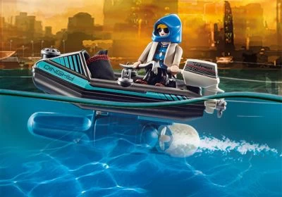 – Spielefigur Kunsträuber mit Schlauchboot und Außenbordmotor