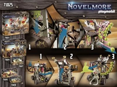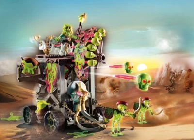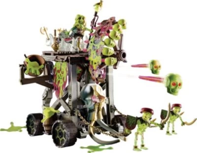 Die Skelettarmee darf man nicht unterschätzen! Der große Angriffsturm, der auf zwei Rollen von Skelettkriegern bewegt wird, ist für die Gegner gefährlich. Mit dem Spieleset PLAYMOBIL® Sa’lahari Sands – Donnerthron (71025) können die spannenden Geschichten rund um die Skelettarmee nacherzählt und eigene Action-Momente erfunden werden. Auf dem Turm verarbeiten die Skelette eine eklige schleimige Substanz zu Geschossen, die mit dem Schleimkatapult verschossen werden. Durch das Schwenken des Kessels werden die Schleimpfützen auf das Katapult geleert und durch das Herunterklappen des Geschossmagazins wird das Katapult ausgelöst. Außerdem ist der Turm mit einer Schnellschussfunktion ausgestattet, die Totenkopfgeschosse abfeuert. Da heißt es in Deckung gehen. In dem Spielset enthalten ist der fahrbare Angriffsturm der Skelettarmee mit neu entwickelter mechanischer Abschuss- bzw. Katapultfunktion, drei Skelett-Krieger und jede Menge Zubehör für spannende Action-Momente.