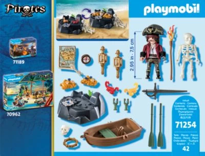 Dieses coole Piraten-Starterpack (71254) aus dem Hause PLAYMOBIL® eignet sich klasse, um spannende Piratenabenteuer und Schatzsuchen nachzuspielen! Der Pirat ist mit seinem Ruderboot auf den Meeren der Welt unterwegs und hat nur ein Ziel: endlich den Goldschatz zu finden! Die Landkarte und der Kompass helfen ihm dabei, die versteckte Insel zu finden. Mit der Fackel und dem Schwert verteidigt der mutige Pirat sich gegen das gruselige Skelett und die Skorpione. Um den Schatz zu finden, müssen viele Herausforderungen bewältigt werden! Nach einer abenteuerlichen Reise gelangt der Pirat endlich zu dem Schatzfels und kann sich wieder auf die Heimreise begeben. Welche Erlebnisse wohl nun auf ihn warten?