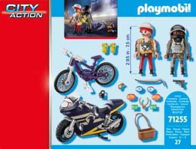Mit dem coolen Spielset “Starter Pack SEK und Juwelendieb” (71255) aus dem Hause PLAYMOBIL® lassen sich besonders spannende Verfolgungsjagden nachspielen! Der Dieb hat mit Hilfe seiner Brechstange einen Juwelier überfallen und verschiedene Schätze gestohlen. Schnell macht er sich mit seinem Fahrzeug davon, doch der Polizist nimmt mit seinem Motorrad die Verfolgung auf. Ob er den Dieb wohl erwischt?