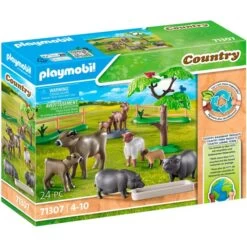 Mit diesem Tierfiguren-Set aus der Serie PLAYMOBIL Country kommt Leben auf den Bauernhof: Insgesamt sind 10 Tiere enthalten – darunter auch Jungtiere und Vögel. Hinzu kommen Zäune, ein Baum und ein Futtertrog. Art.-Nr.: 1889113
